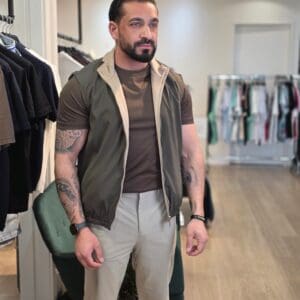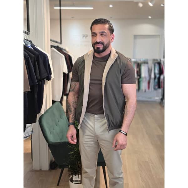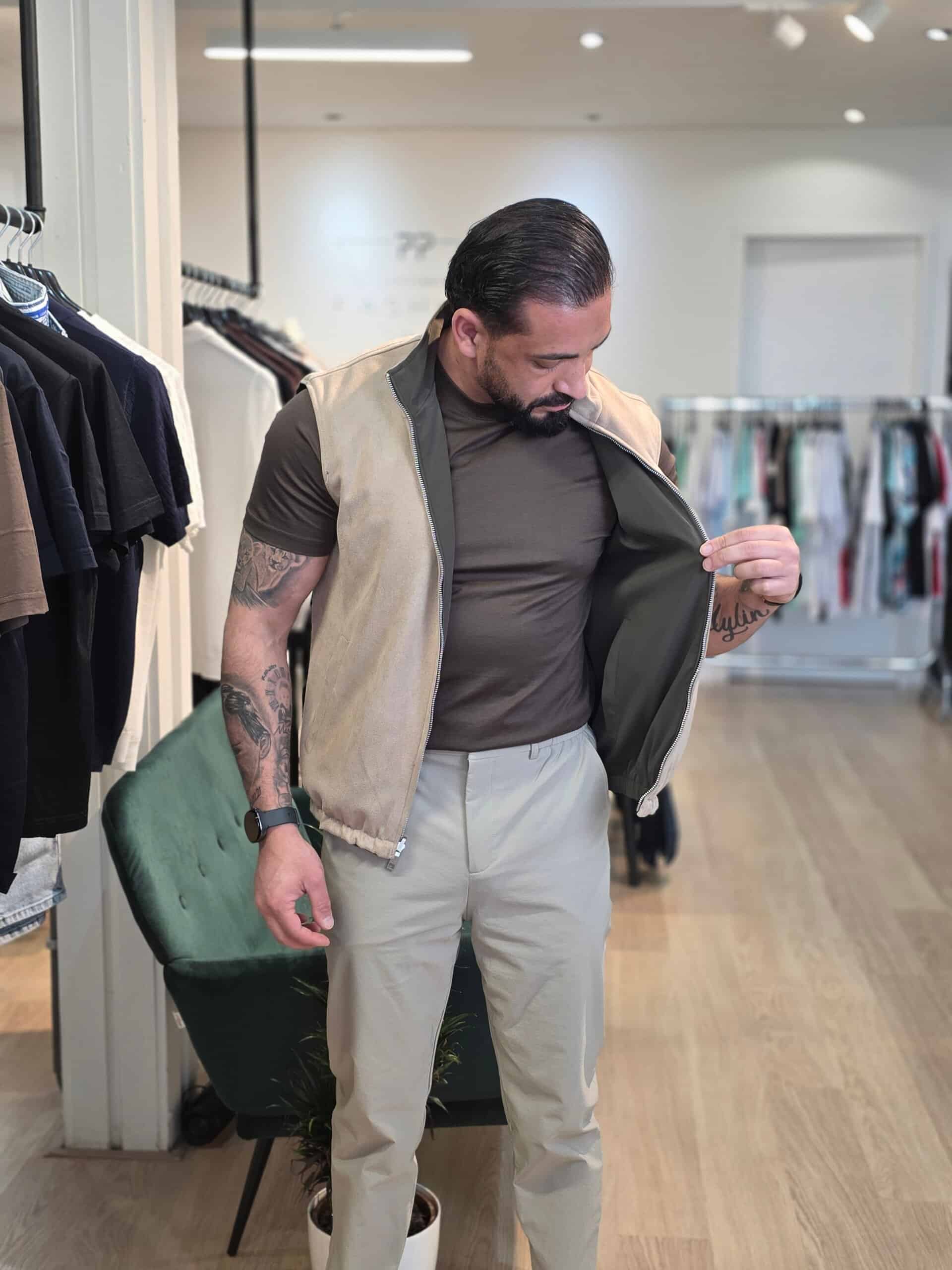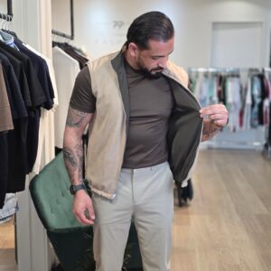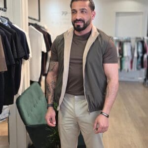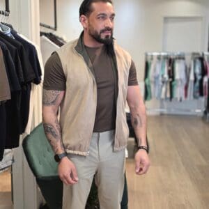 Stijl en veelzijdigheid komen samen in deze dubbelzijdige suède bodywarmer. Dankzij het luxe suède materiaal en het omkeerbare design kies je moeiteloos tussen twee verschillende looks.