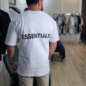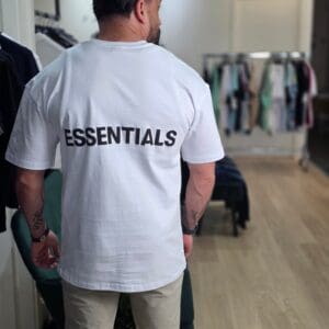 Op de achterkant staat een opvallende tekstprint met de woorden “Essentials London” in een combinatie van strakke en handgeschreven letterstijlen.