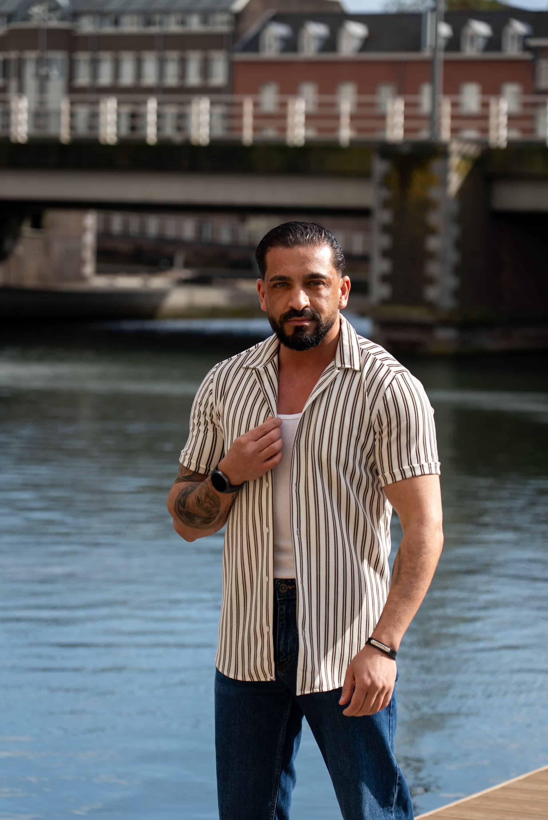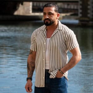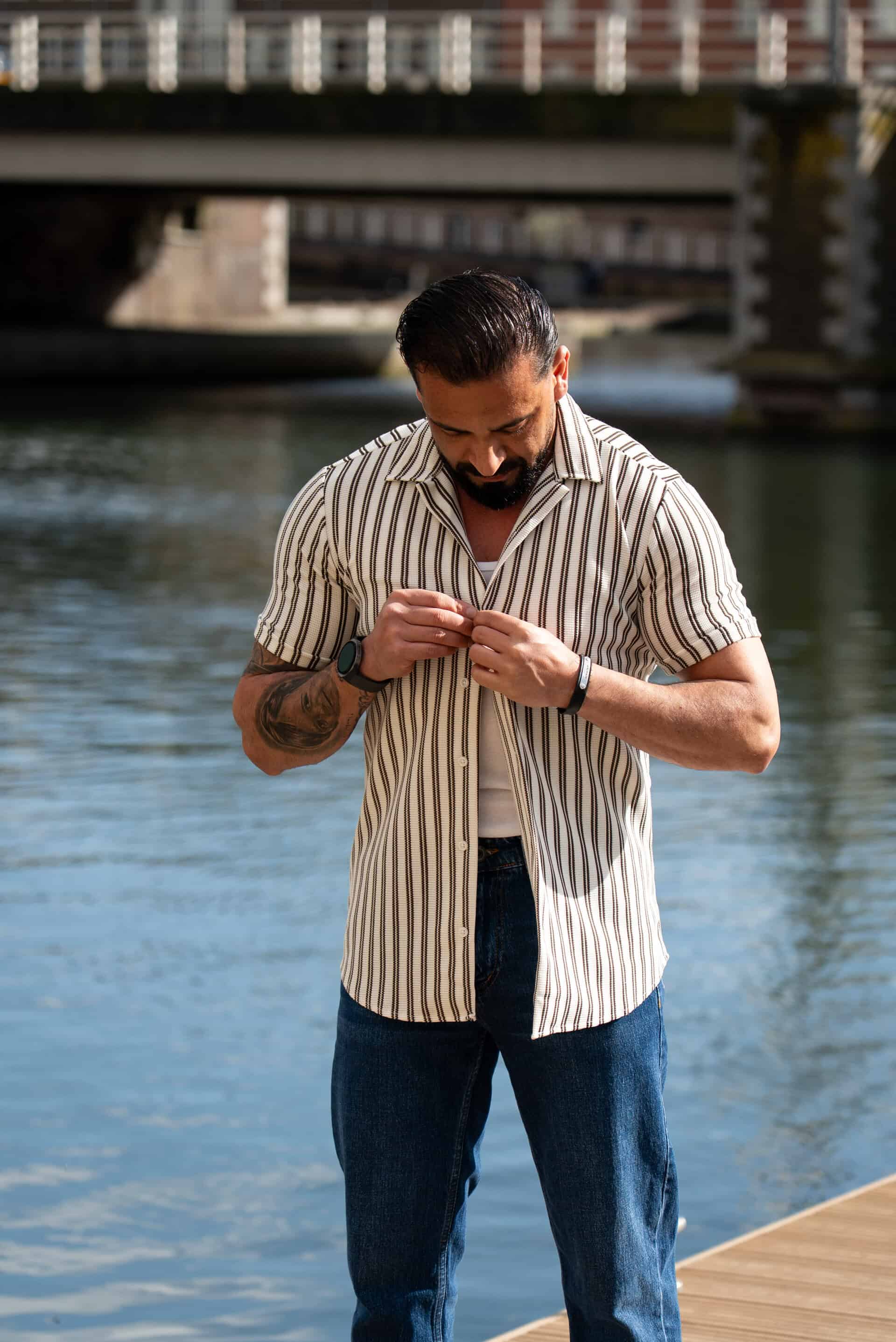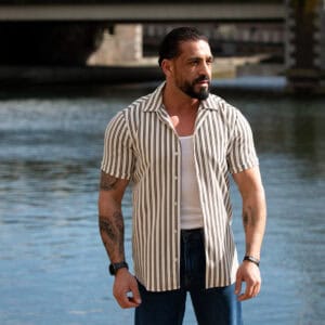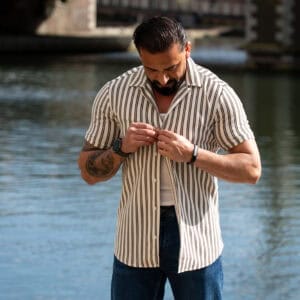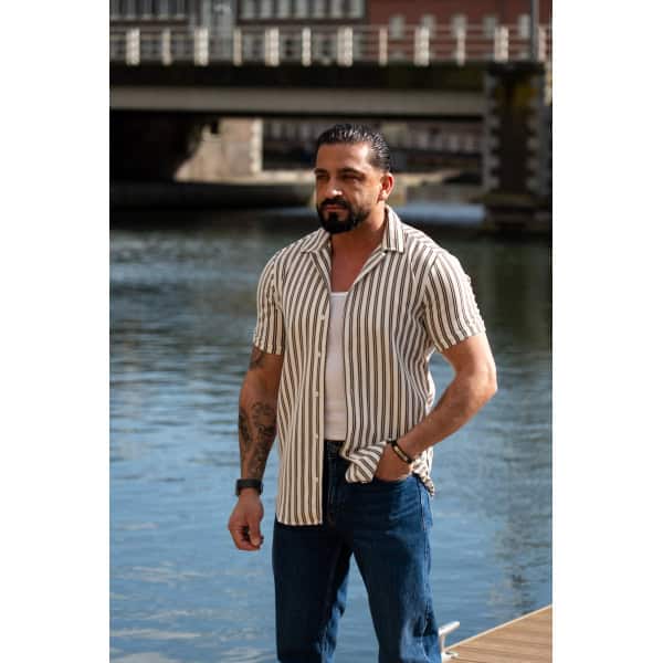 Ga stijlvol de zomer in met dit moderne gestreepte heren overhemd met korte mouwen. Het overhemd heeft een slanke (slim fit) pasvorm die het lichaam mooi volgt en zorgt voor een verzorgde, eigentijdse uitstraling. De verticale strepen geven een verfijnde en tegelijkertijd casual look, perfect voor zowel dagelijkse outfits als zomerse gelegenheden.