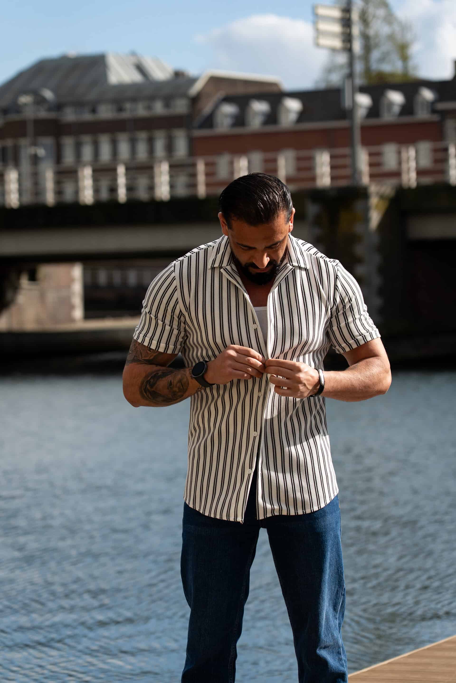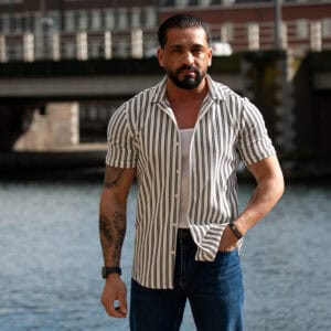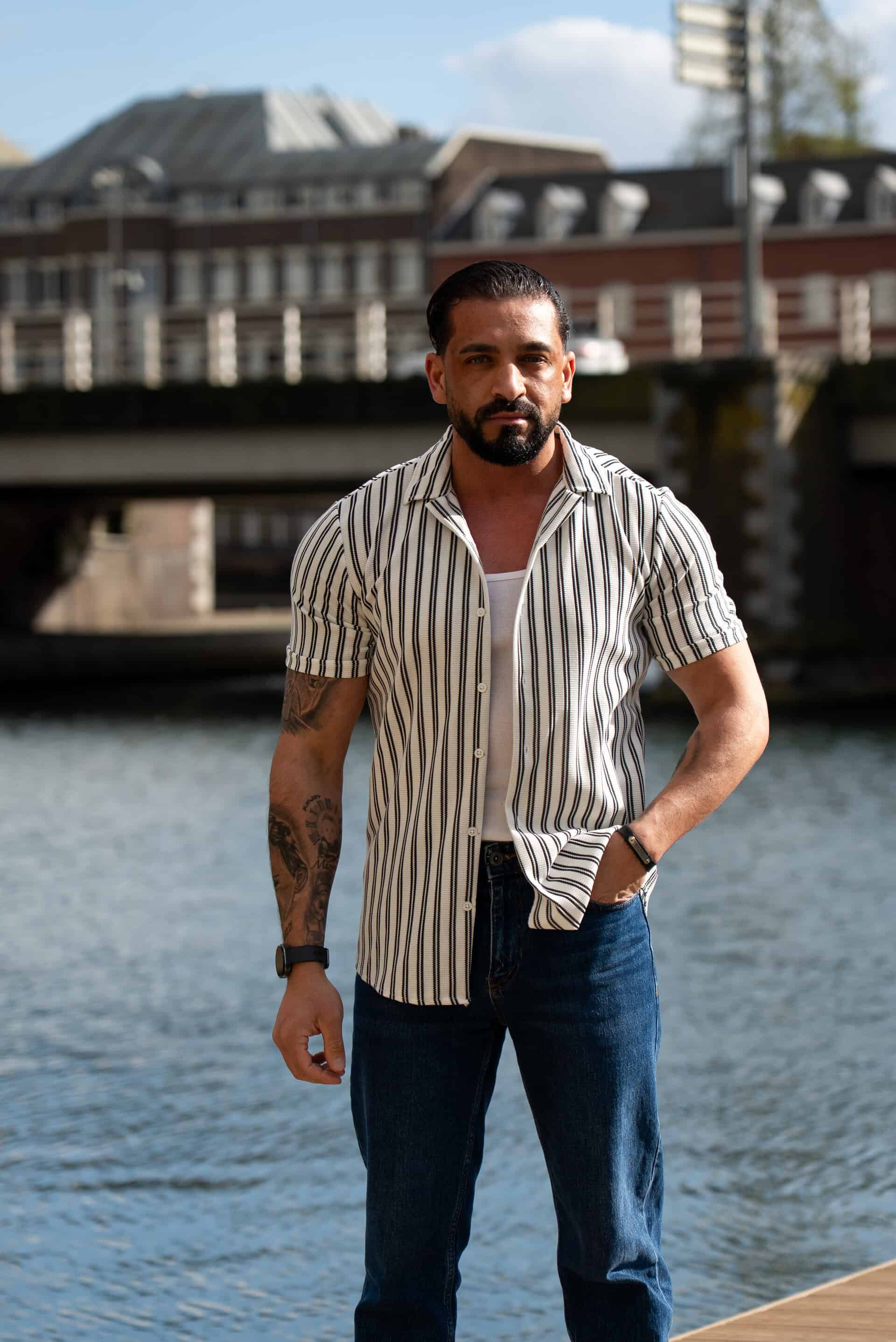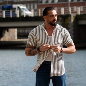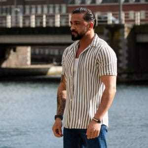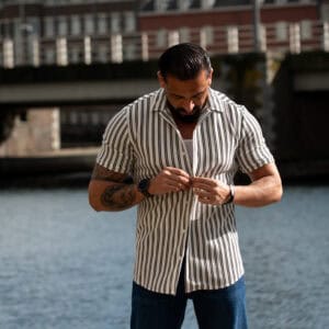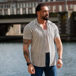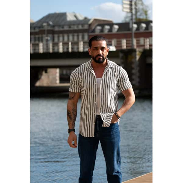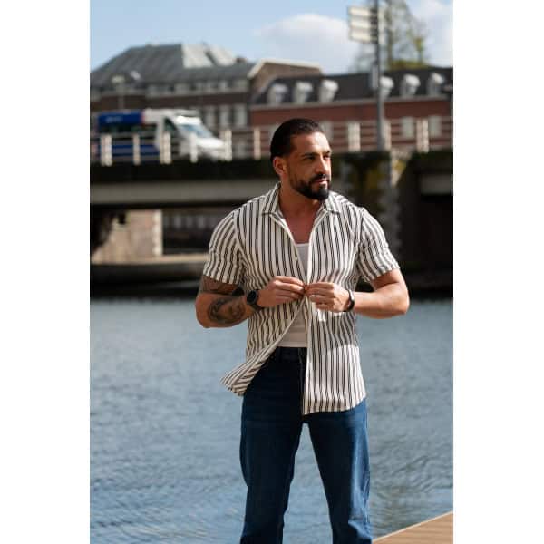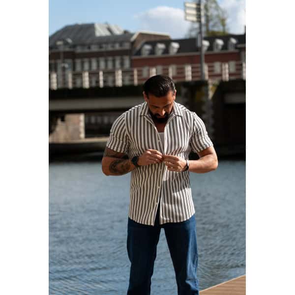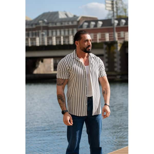 Ga stijlvol de zomer in met dit moderne gestreepte heren overhemd met korte mouwen. Het overhemd heeft een slanke (slim fit) pasvorm die het lichaam mooi volgt en zorgt voor een verzorgde, eigentijdse uitstraling. De verticale strepen geven een verfijnde en tegelijkertijd casual look, perfect voor zowel dagelijkse outfits als zomerse gelegenheden.