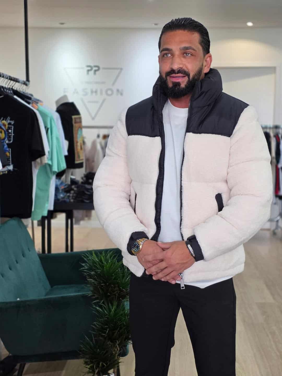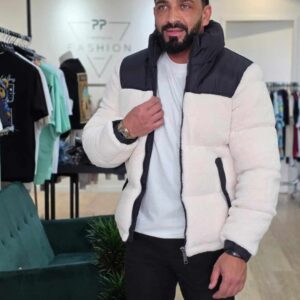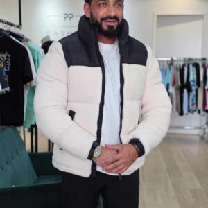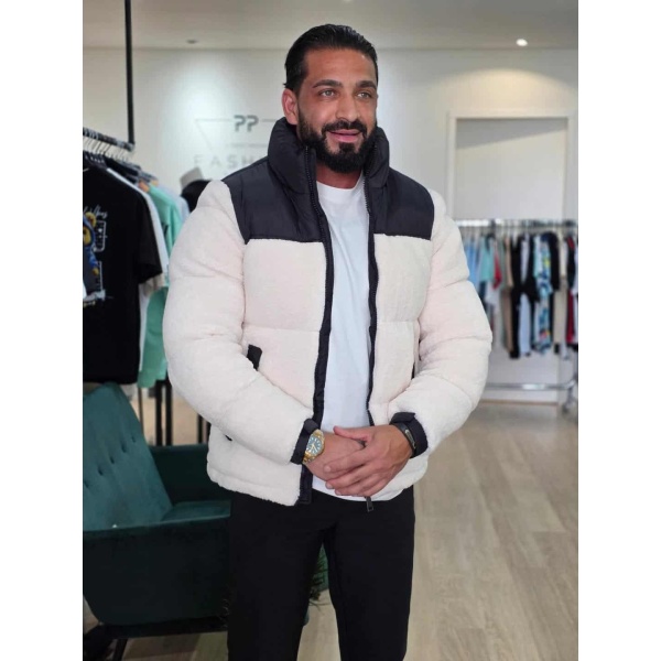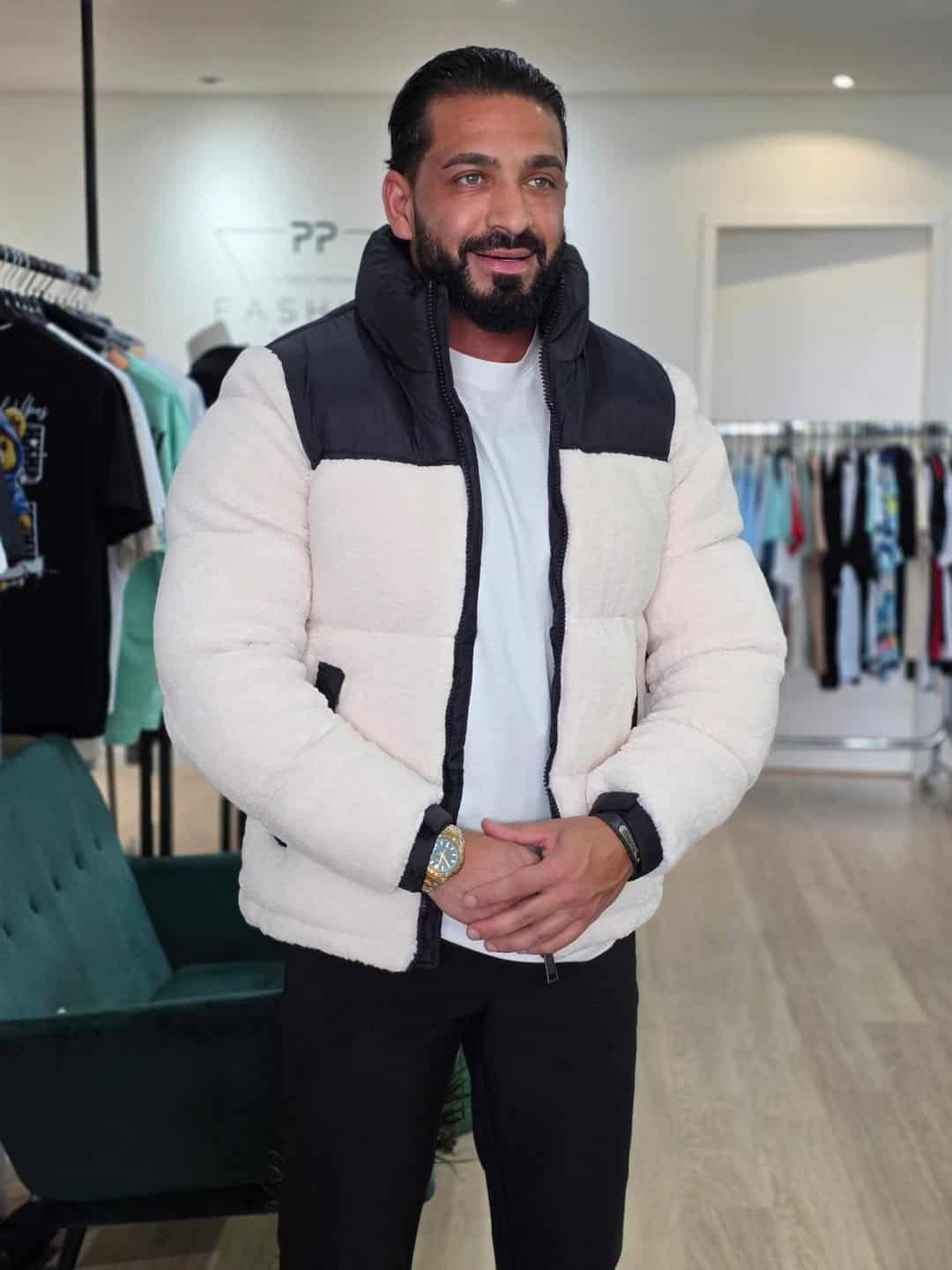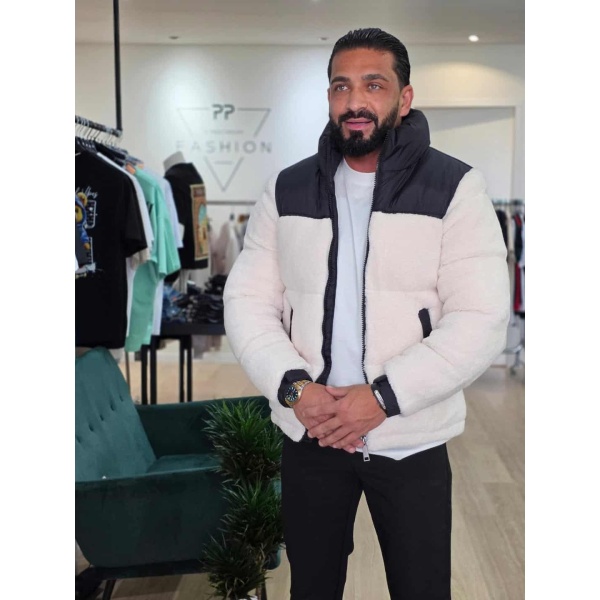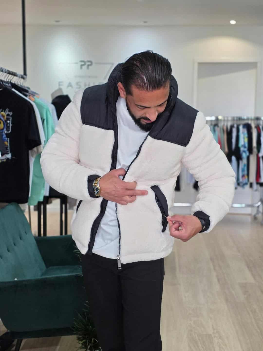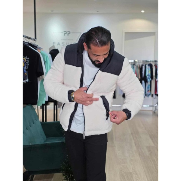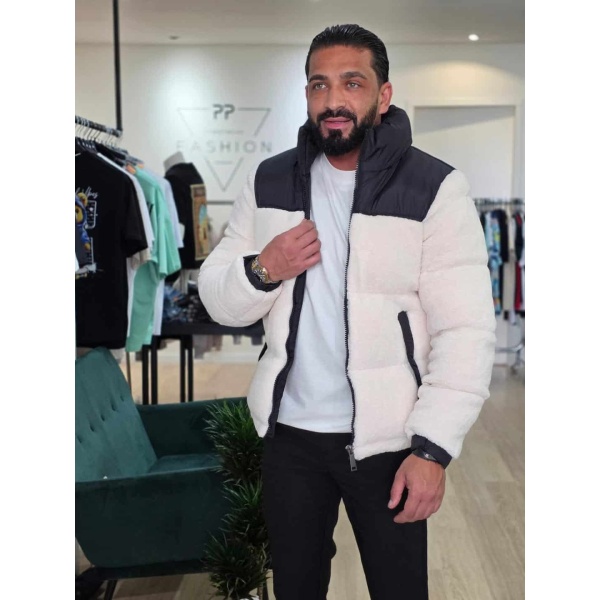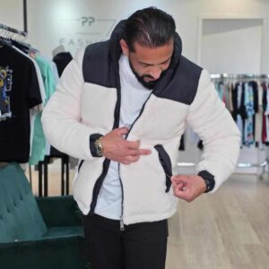 Deze jas combineert warmte en stijl in één. Het zachte teddy-materiaal in gebroken wit voelt comfortabel aan en houdt je warm, terwijl de gewatteerde schouderpartij in contrasterend zwart of beige zorgt voor een stoere, moderne look.